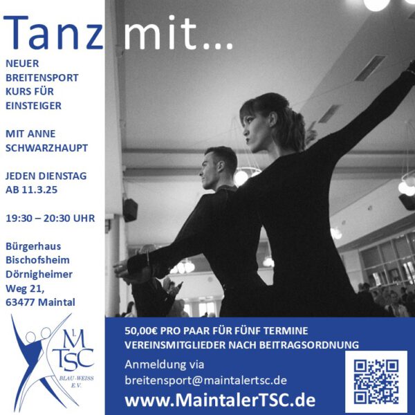 Der 1. Maintaler Tanzsportclub (MTSC) freut sich, Anne Schwarzhaupt als neue Trainerin für die Dienstagsgruppen begrüßen zu dürfen. Die aktive Latein- und Standardtänzerin bringt ihre Leidenschaft und Begeisterung in ihre…