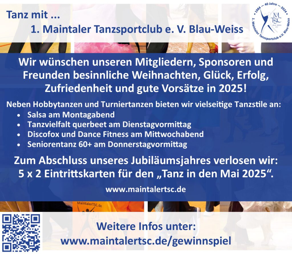 Wir wünschen unseren Mitgliedern, Sponsoren und Freunden besinnliche Weihnachten, Glück, Erfolg, Zufriedenheit und gute Vorsätze in 2025! Neben Hobbytanzen und Turniertanzen bieten wir vielseitige Tanzstile an: Salsa am Montagabend Tanzvielfalt…